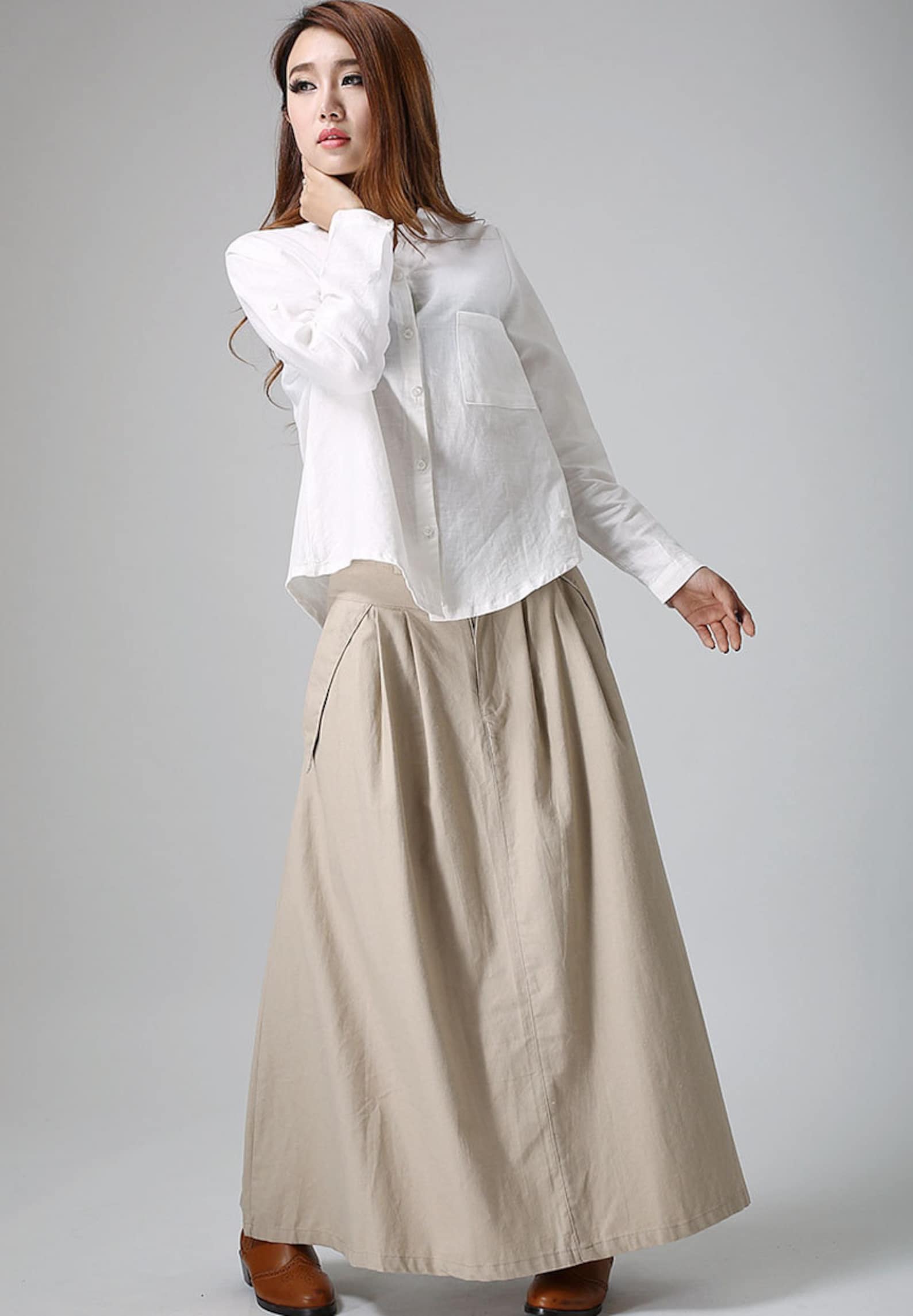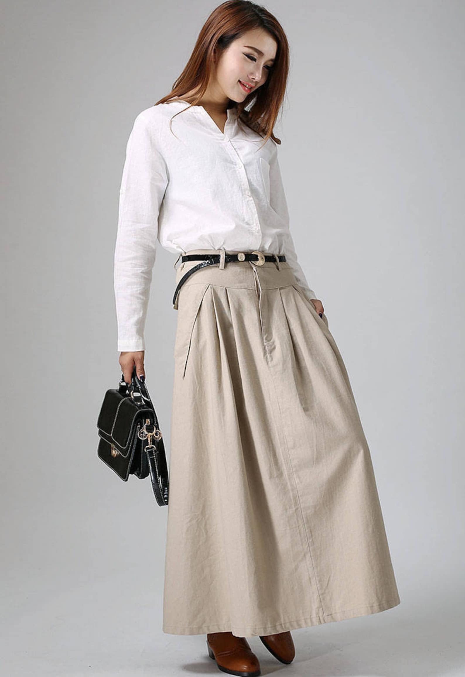 Classic A-Line Shape: Flared maxi hem with neat pleats creates volume and flow, adding both comfort and sophistication.
