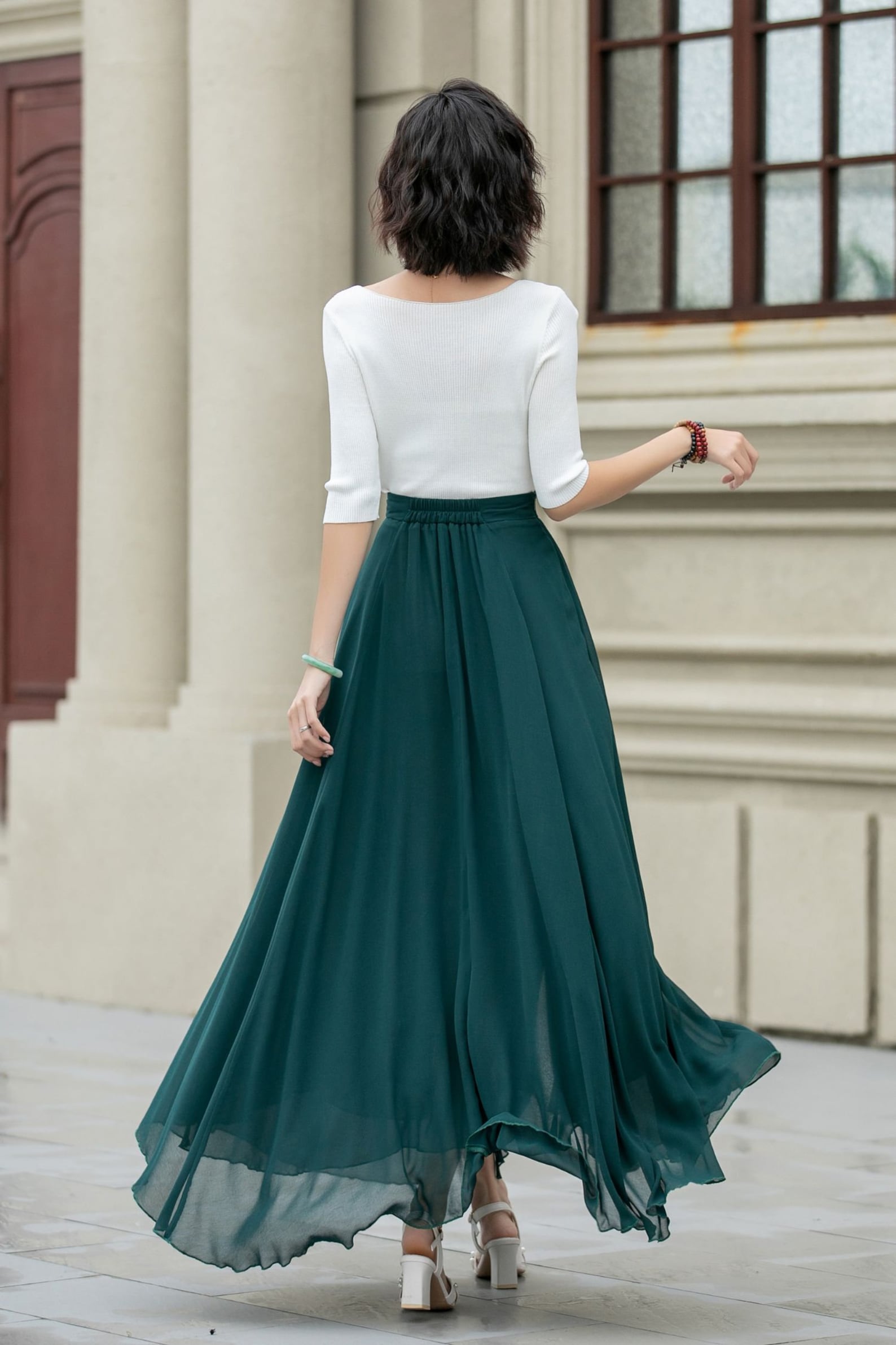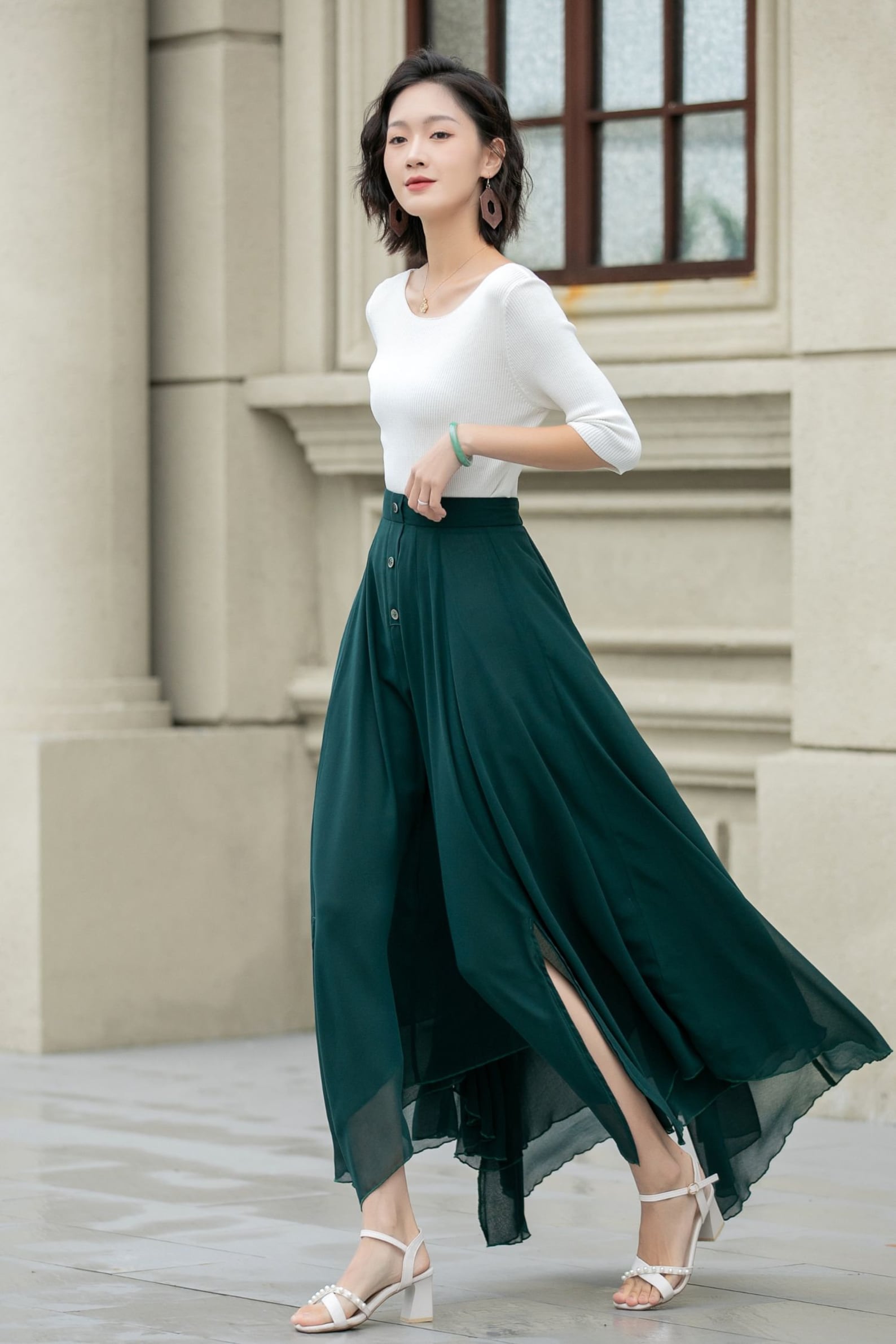 Be the first to review “Dark green high waist chiffon front slit maxi skirt”